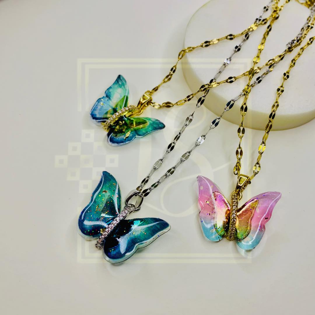 Collar de colgante de cobre de mariposa colorida con circonita, accesorios de joyería, cadena de acero inoxidable.